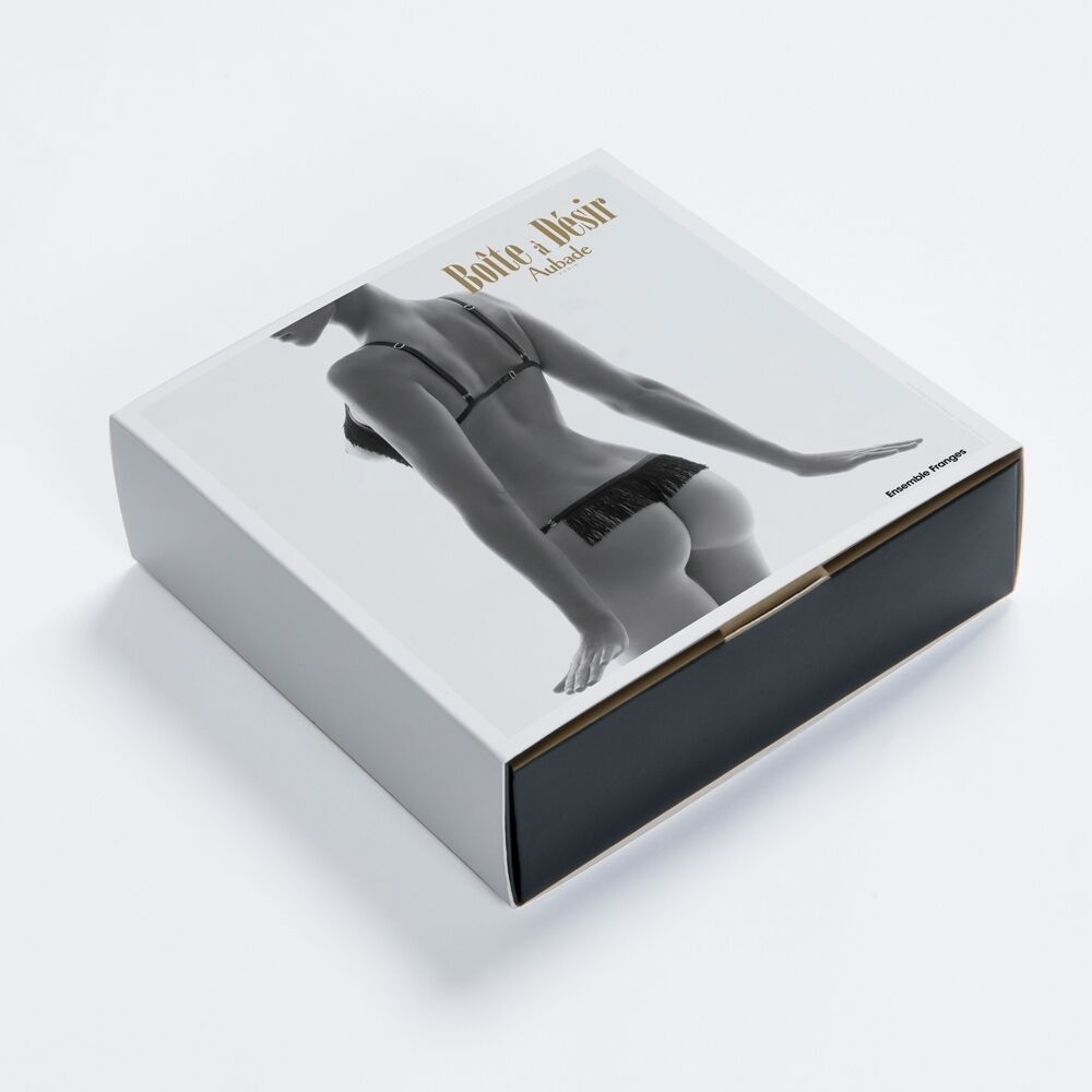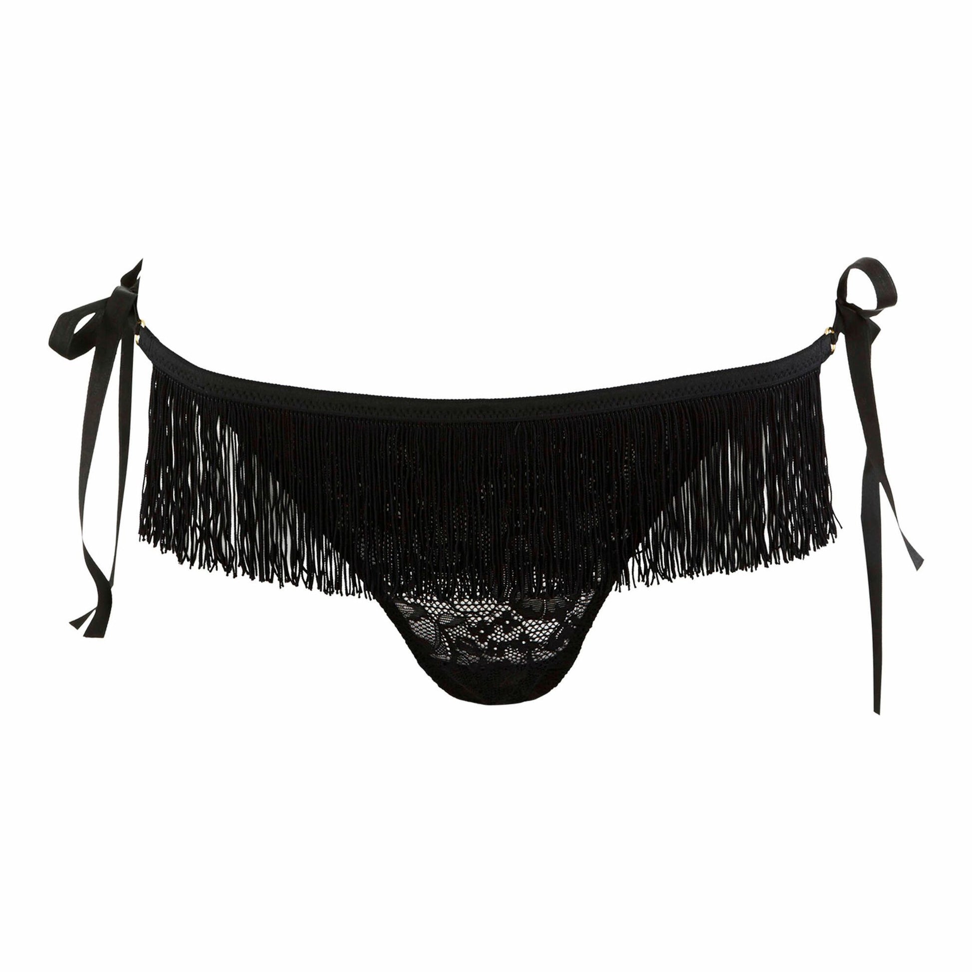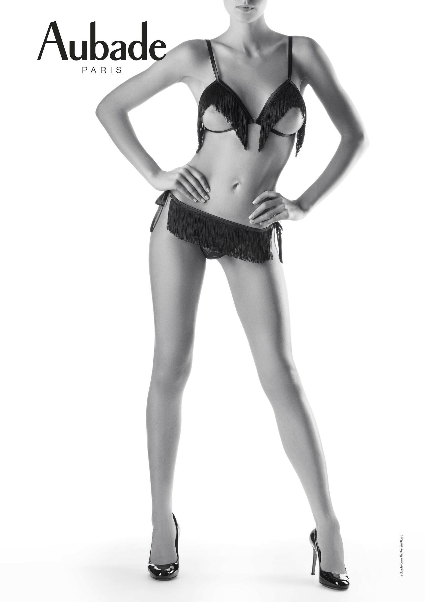 Mini and sexy, the Aubade Boite à Désir fringed lingerie set is incredibly flirty. A black band traces the shape of the triangle bra and thong on the skin, while the fringing covers and uncovers the figure in a highly erotic fashion. This fabulously daring set makes a real statement with its burlesque chic feel, fringing and eroticism which is the DNA of this incredibly seductive lingerie.
