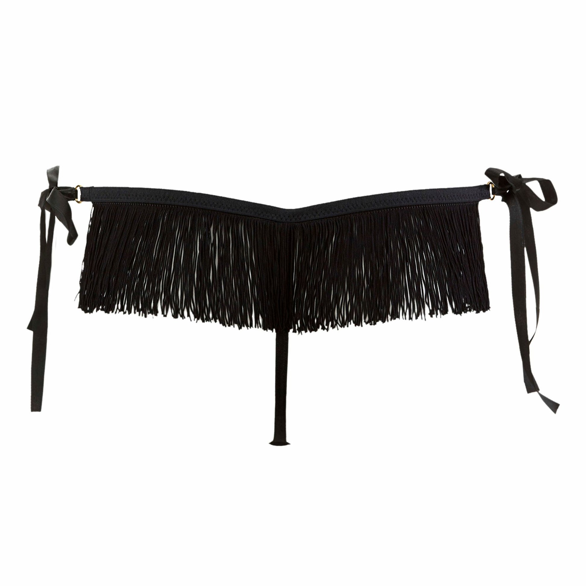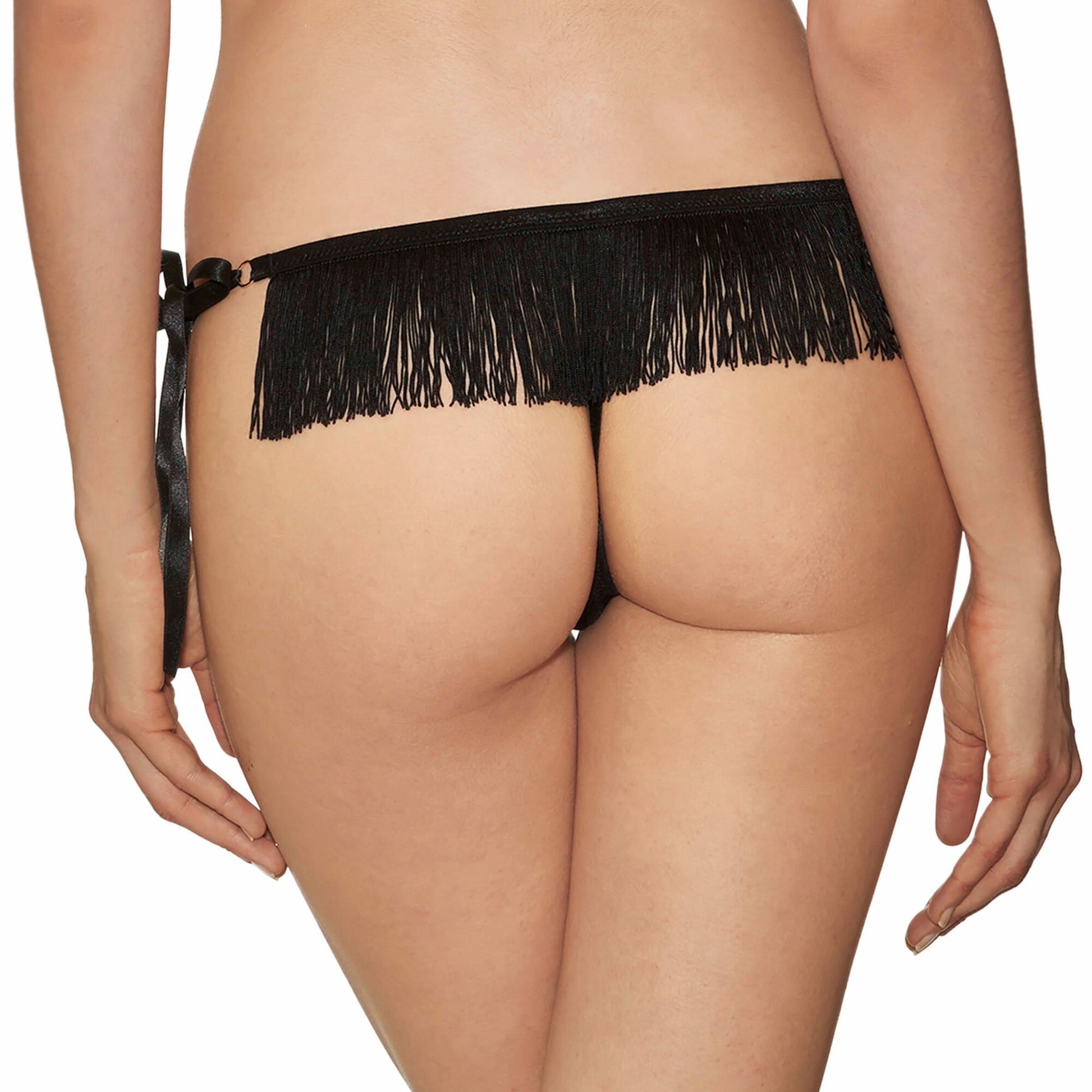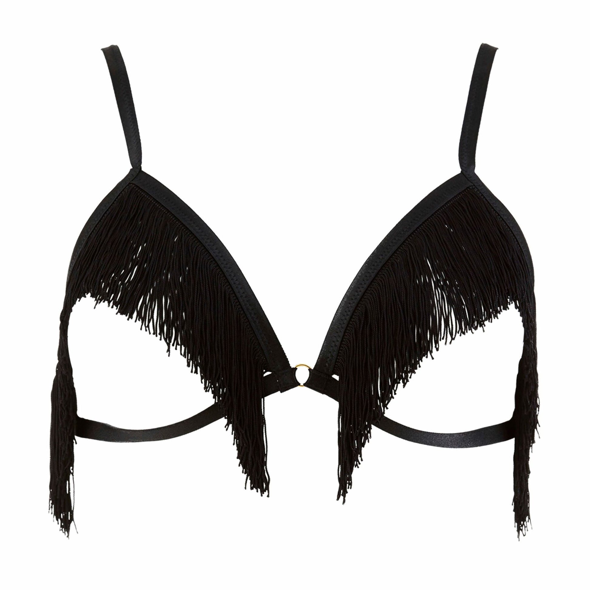Mini and sexy, the Aubade Boite à Désir fringed lingerie set is incredibly flirty. A black band traces the shape of the triangle bra and thong on the skin, while the fringing covers and uncovers the figure in a highly erotic fashion. This fabulously daring set makes a real statement with its burlesque chic feel, fringing and eroticism which is the DNA of this incredibly seductive lingerie.