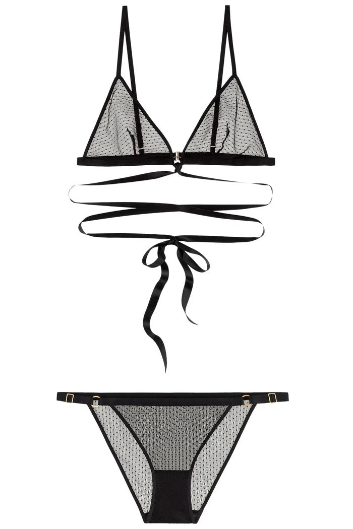 This gorgeous set of bra and briefs from the opulent Jeux de Nuit from Aubade can be worn as a luxury set and an erotic secret under your every day clothing, or you can show off your beautiful figure to your partner in a steamy bedroom setting. Te set is made of sheer dotted material which only further enhances its sensual feel. The golden hardware strewn throughout the pieces adds an opulent vibe to this set.