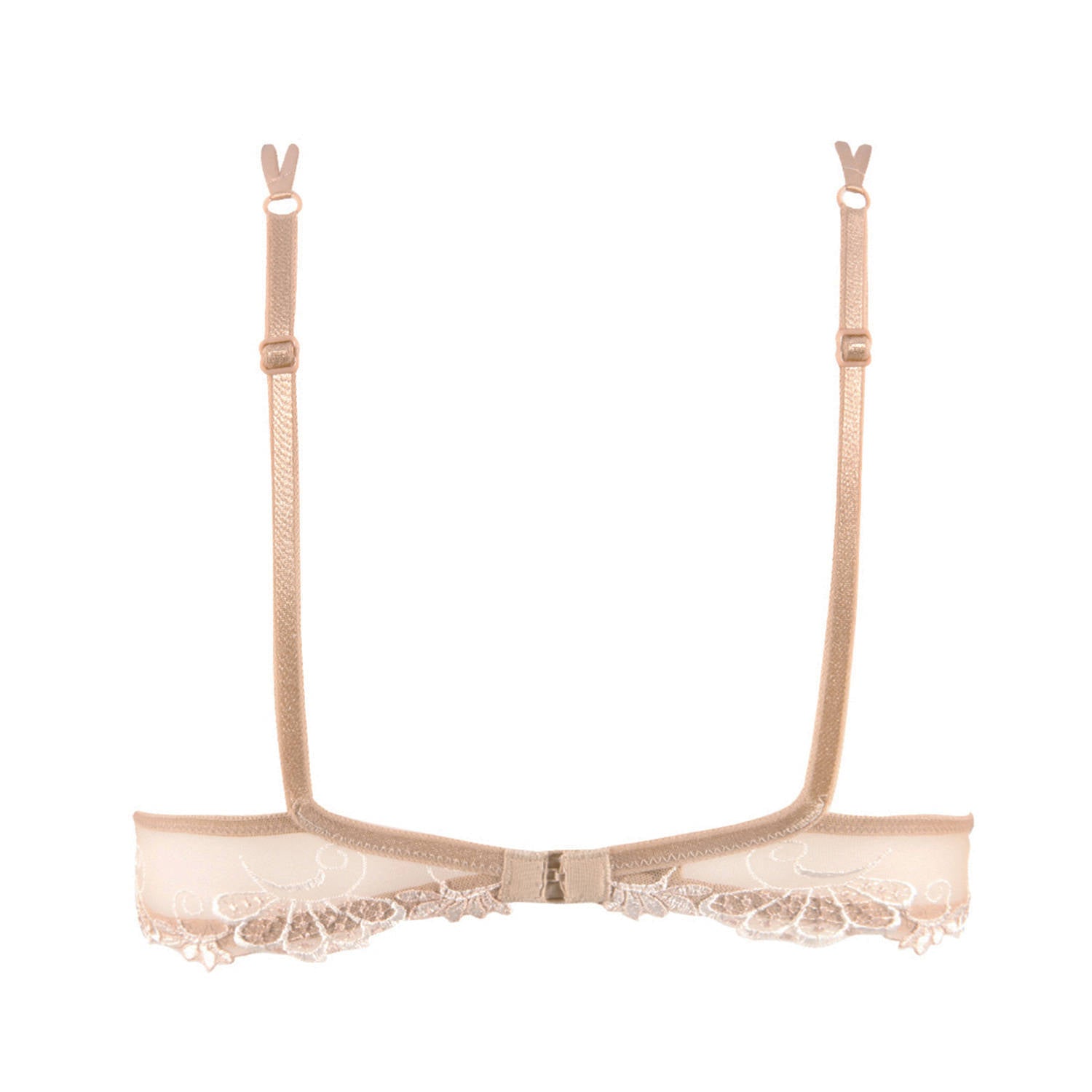 Underwired with beautiful floral embroidery, this demi cup bra offers a curved cleavage full of feminity. The spaghettis straps are thin and adjustable for more lightness and feminity. Guipure yokes for tatoo effect on the cups and at the back panel. Refined Swarovski gem as a finishing touch.